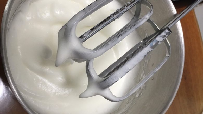 6. 继续搅打50圈,蛋白硬挺,出现直立的小尖峰。