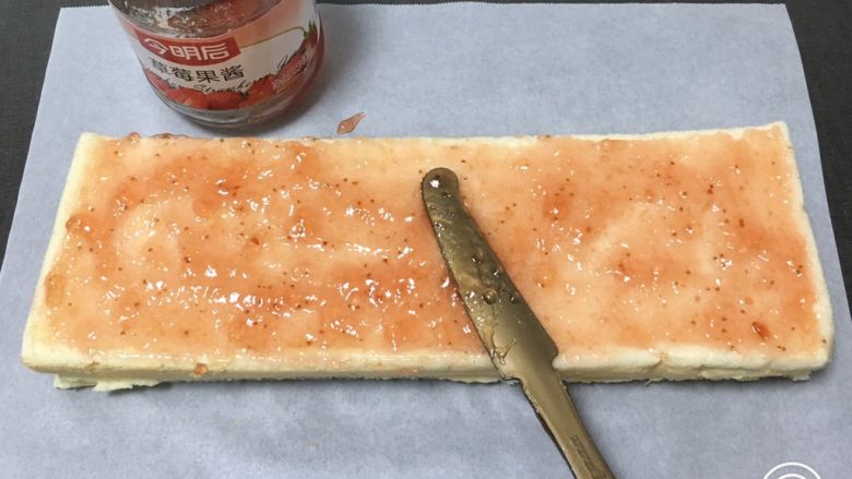 20. 蛋糕切成三片,抹上薄薄的一层草莓果酱。
