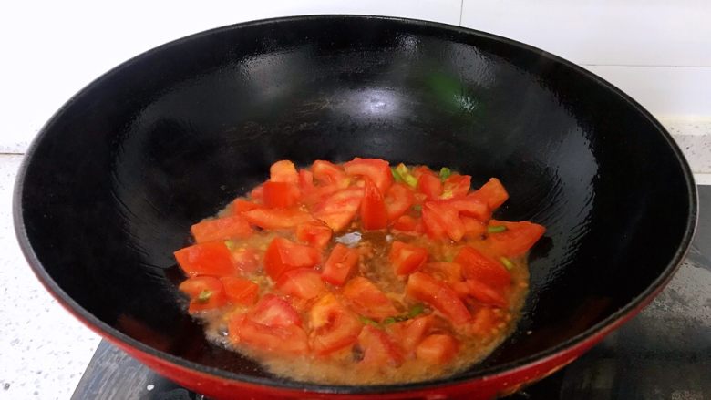 7. 放入番茄丁,中小火炒至番茄软烂出汁。如果番茄不是特别理想,此步骤可加入适量番茄酱一起炒。