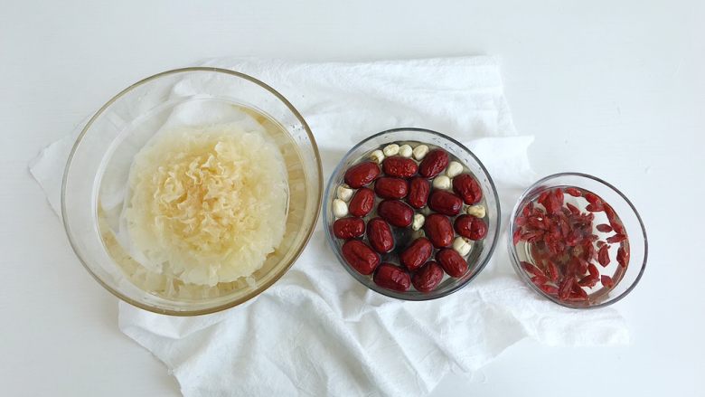 3. 银耳凉水泡发 红枣和莲子冷水浸泡 枸杞稍微用凉水泡一下冲洗干净表面积尘