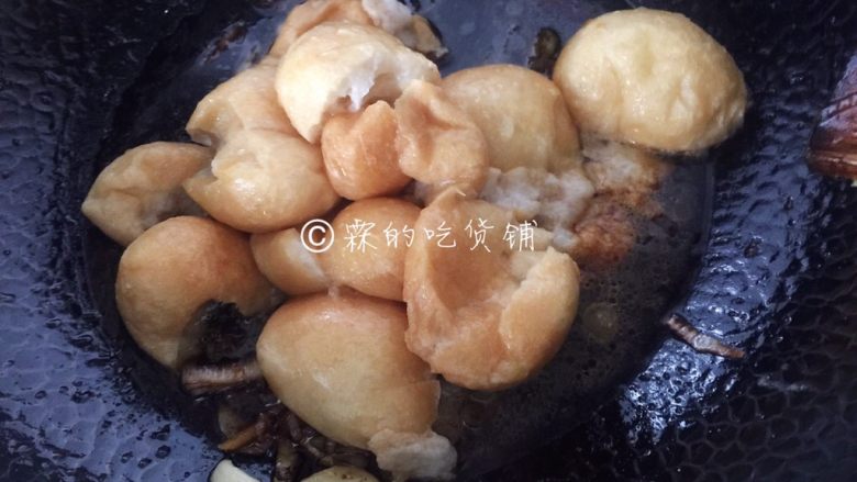 12. 放入面筋稍微翻炒一下,加小半碗水,随后盖上锅盖焖煮1、2分钟。