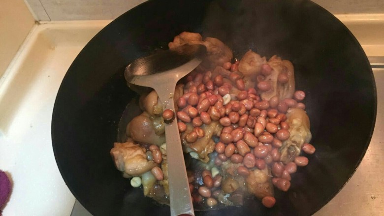 8. 加入煸炒好的熟花生米。