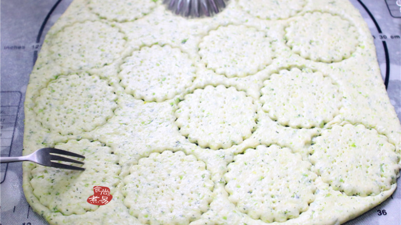 7. 取一个模具,按压出饼干的图形,再用叉子在饼干上戳些孔,以防膨胀后开裂。我用了两种模具,分别做了两款不一样的形状。