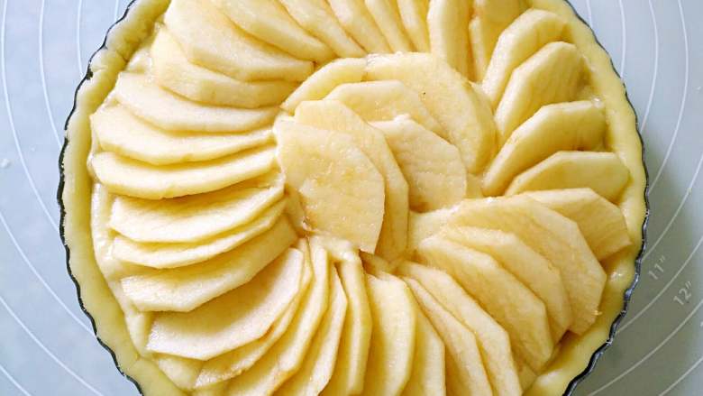 11. 将苹果去皮去核切片,均匀铺在内馅上,表面抹融化的黄油
