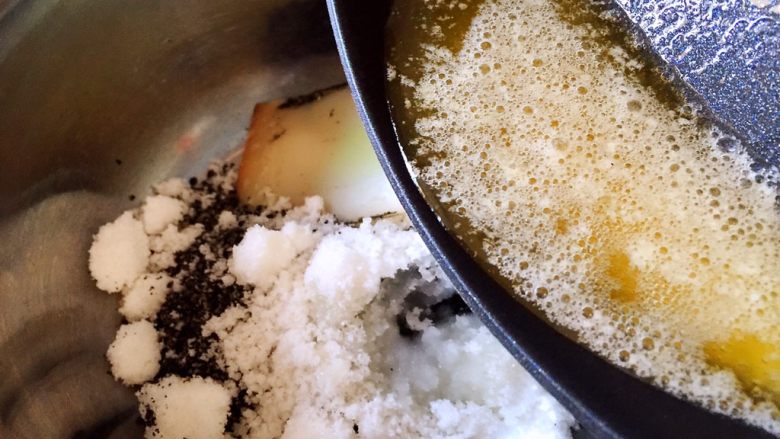 9. 白面团和可可面团用料分别放入两个碗中,倒入开水和凉水