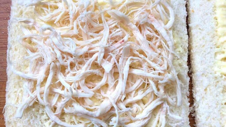- 烤盘中也可以刷黄油,我用的是玉米油,煮鸡脯肉的时候我没有放盐,是怕放盐早了肉不烂,怕柴,所以撕好了才放的盐,也可以煮好,撇去浮末,放盐泡一会。