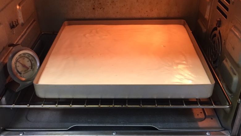 13. 将蛋糕糊倒入金盘,震几下刮平表面。
