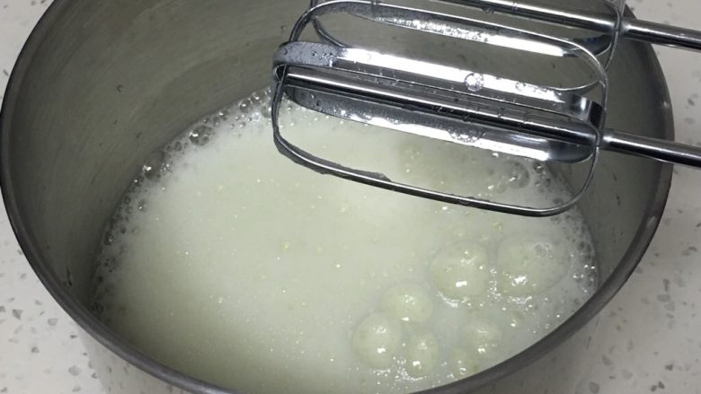 2. 用打蛋器高速搅打50圈,蛋白变白蓬发,再加入15克细砂糖。
