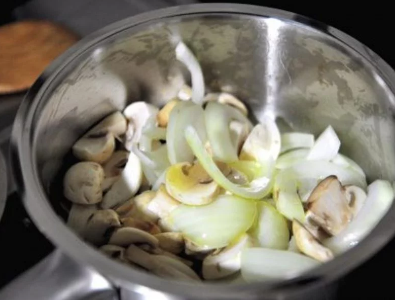 2. 汤锅内放入少量橄欖油,下洋葱和蘑菇拌炒至香气出来后,再下奶油并炒至融化