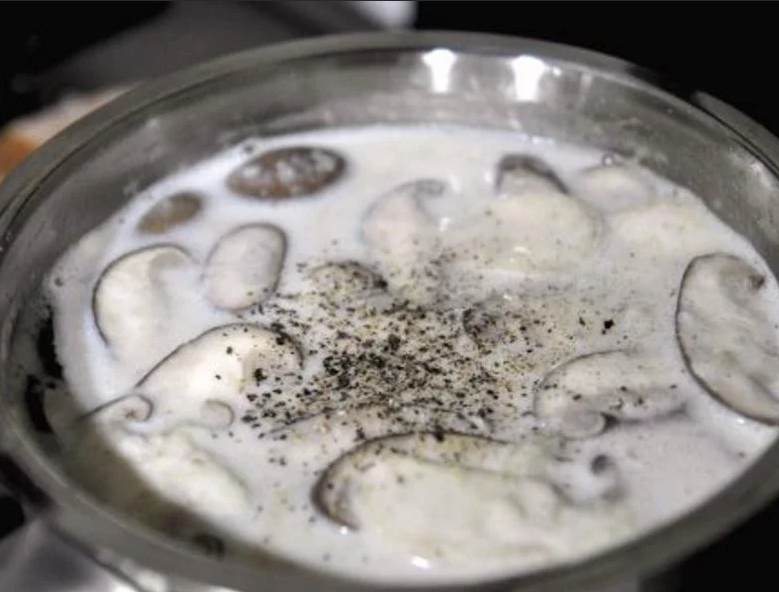 6. 此时浓汤已经成形囉,接著加入松本茸和牛奶以中小火续煮