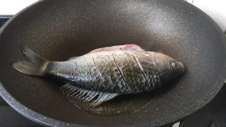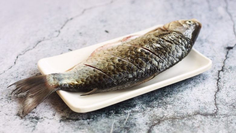 2. 将鲫鱼刮鳞、去除内脏,清洗干净,沥干水分,在鱼的两面用到划几刀,方便入味。