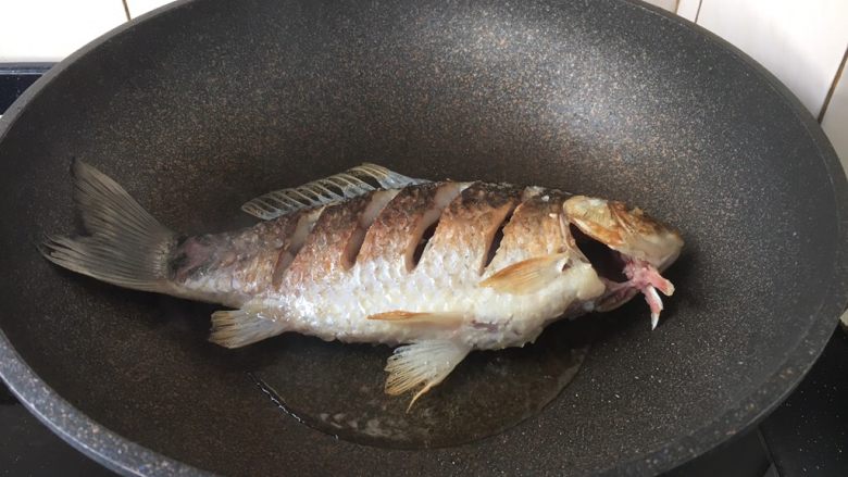 6. 把鲫鱼两面都煎成微微的金黄色,盛出备用。