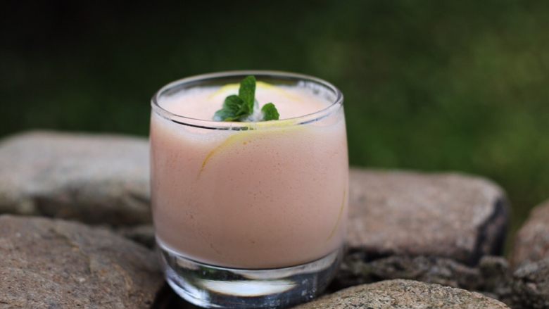 5. 6.将柠檬片贴在杯壁上,倒入思慕雪,点缀上薄荷叶子即可。