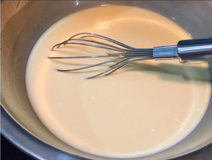 3. 鲜奶跟砂糖混在一起,稍微加热,让砂糖溶化即可,打入鸡蛋拌匀,过筛两次。