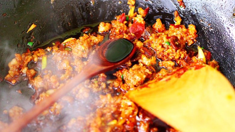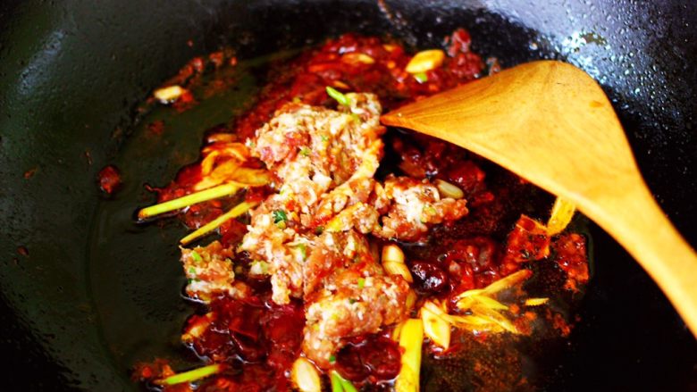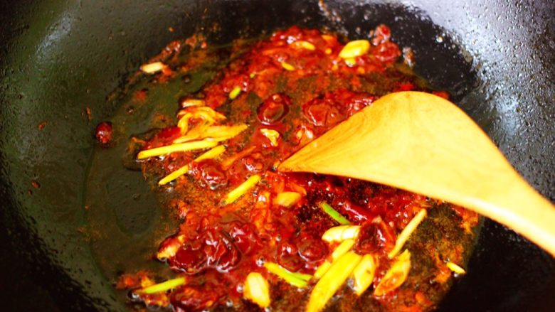 11. 大火翻炒郫县豆瓣酱至变色出红油的时候。