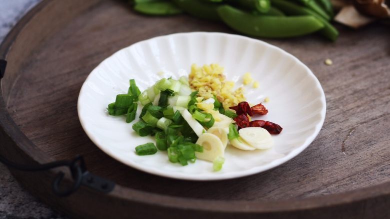 5. 小香葱切成葱花、蒜切片、姜切成姜末、辣椒切成小段。