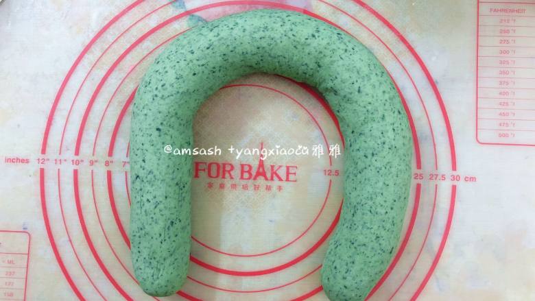 3. 把中筋粉300克,酵母3克,细砂糖20克,和打好的菠菜汁150克,倒入面包机桶内,启动面包机和面功能,揉成团。揉到面成团之后把10g的食用油放入面团中继续揉至面团光滑,我这里揉了20分钟