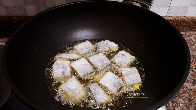 7. 捞出煎好的带鱼块,锅里留少量油。