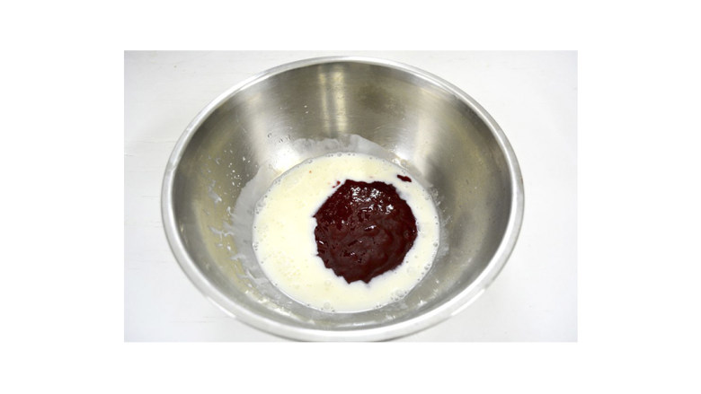 3. 未打发淡奶与草莓果酱搅拌均匀。
