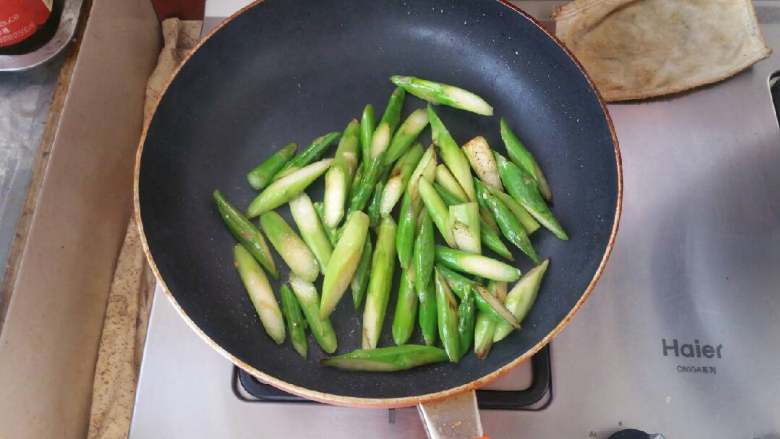 7. 芦笋下锅煸炒至表面焦黄。