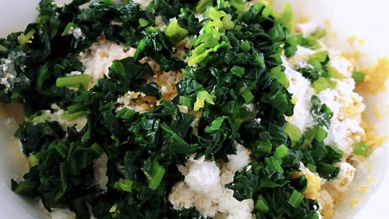 6. 另一面盆中也是加入普通面粉总量的一半,调味料的一半,菠菜草酸太重,一定要焯水后切碎放一起,
