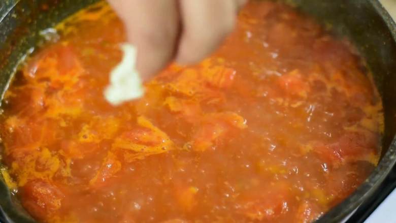 7. 炒出红汤,加入盐、糖、番茄酱调味,再倒入半锅清水烧开。