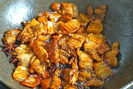 7. 倒入腌好的五花肉、放入八角先翻炒一分钟,微微上色后,再盖上锅盖焖两三分钟;