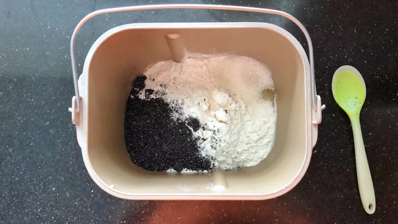 - 面包粉 255克 黑芝麻粉 35克 水 120克 鸡蛋液 40克 白砂糖 40克 盐 2克 干酵母 4克 黄油 20克