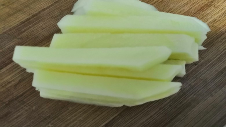 3. 切条状,太粗很难炸,太细没有口感,但如果你喜欢吃嘎吱脆可以细一点,甚至可以切成片,就变成薯片了