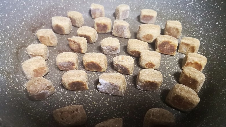10. 把切好的小面片摆放在平底锅小火慢煎。