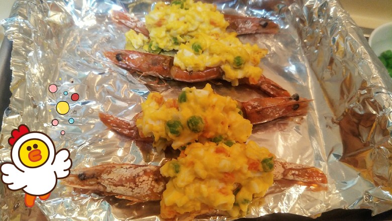 13. 烤箱上火200°先烤十分钟。把虾烤到半熟后再虾背中加入鸡蛋色拉酱