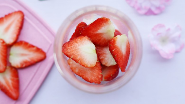 2. 草莓用盐水浸泡几分钟去蒂清洗干净。