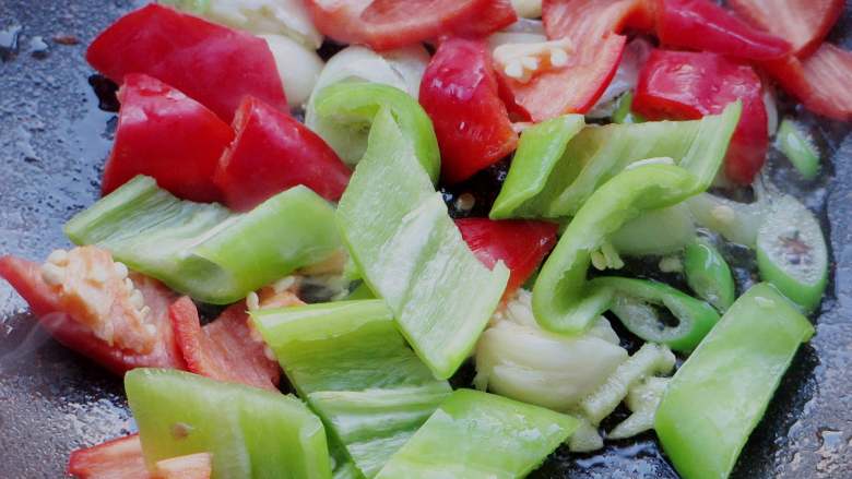 - 4.青椒片入锅之后转成大火翻炒,这样炒好的青椒清脆。