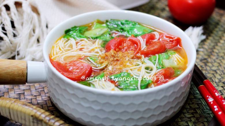 5. 番茄汤烧开后,放入挂面,用筷子把挂面打散开了,再次烧开