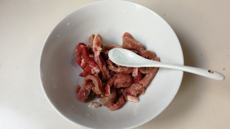 6. 将牛排条放入碗中,放入一克盐