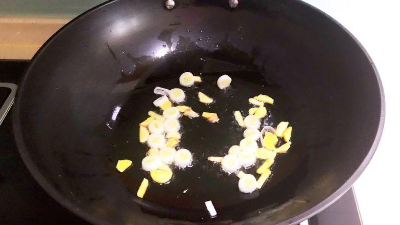 10. 炒锅烧热后加入1勺菜籽油,油烧热后加入葱花和姜片,煸炒出香味