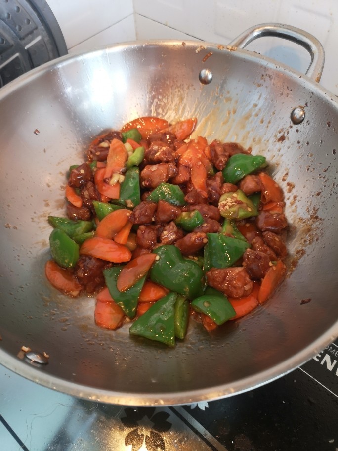 11. 倒入炸好的肉块,调好的酱汁,直到汤汁吸收,青椒微微变色,就可以出锅了