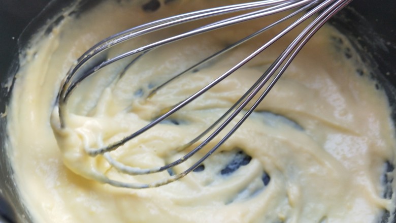 8. 分次少量加入牛奶,边加入,不断搅拌。