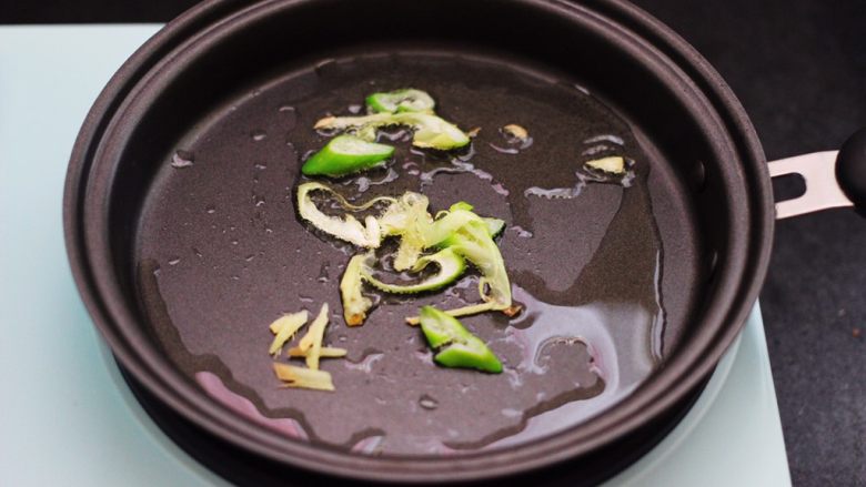 4. 东菱早餐机的锅中倒入花生油烧热后,爆香葱姜丝。
