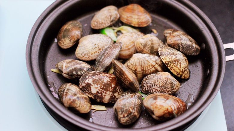 7. 大火烧至所有的花蛤都张开口,即可关火,把炒好的花蛤盛出备用。
