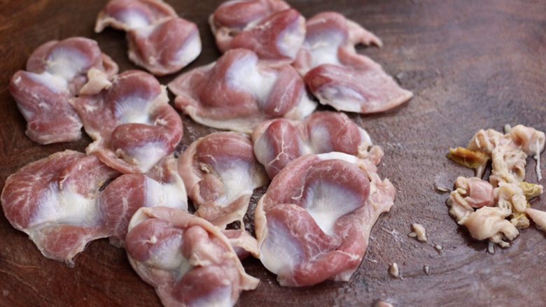 14. 把卤好的鸡胗整个取出,用刀切片装盘食用。