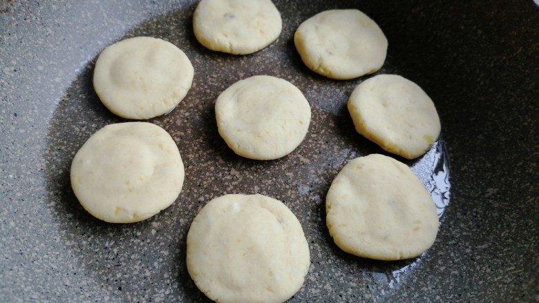 12. 锅里加少许油,中小火烧热后转小火,把做好的糯米饼一个个放入锅中