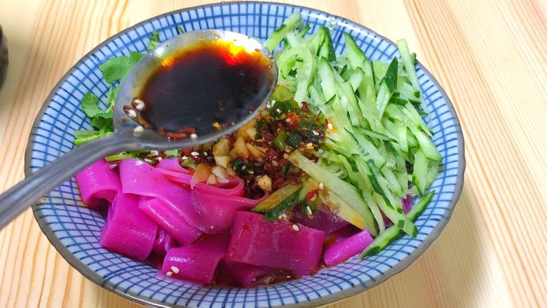 7. 如果你没有专用的凉皮盘子也可以像我一样用平底瓷盘,火锅勺子舀入多半勺摇匀。