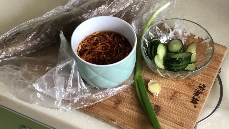 3. 姜切姜丝,小葱分葱白葱绿分别切末