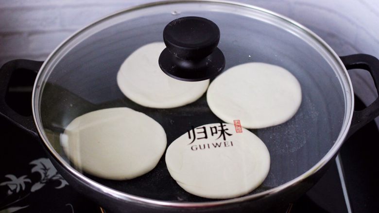 15. 把面饼的一面煎至金黄的颜色后,再盖上锅盖煎另一面。