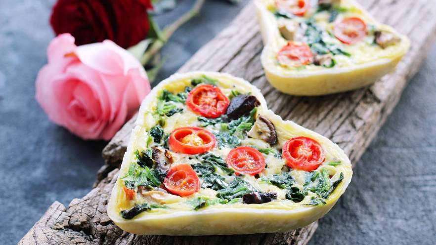 13. 挞皮上先放蘑菇丁,菠菜段,小西红柿和鸭丁