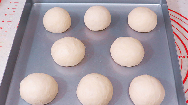 19. 等分成8个小面团,约61g/左右一个,滚圆后盖保鲜膜醒发15分钟。