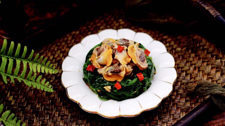 17. 把拌好的菠菜放入盘子里,上面码上煮熟的毛蛤就可以了。