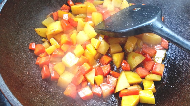 20. 加入炒好土豆,胡萝卜丁翻炒片刻