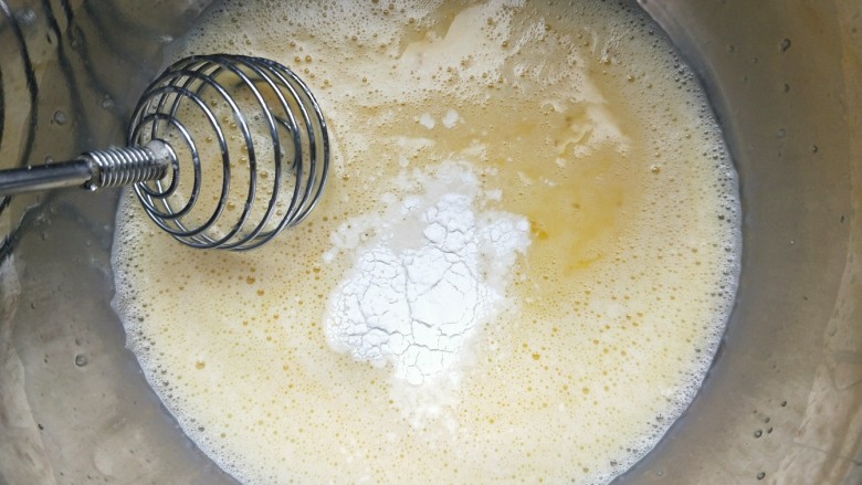2. 鸡蛋充分打散,白糖分两次加入搅拌,一定要完全融化,